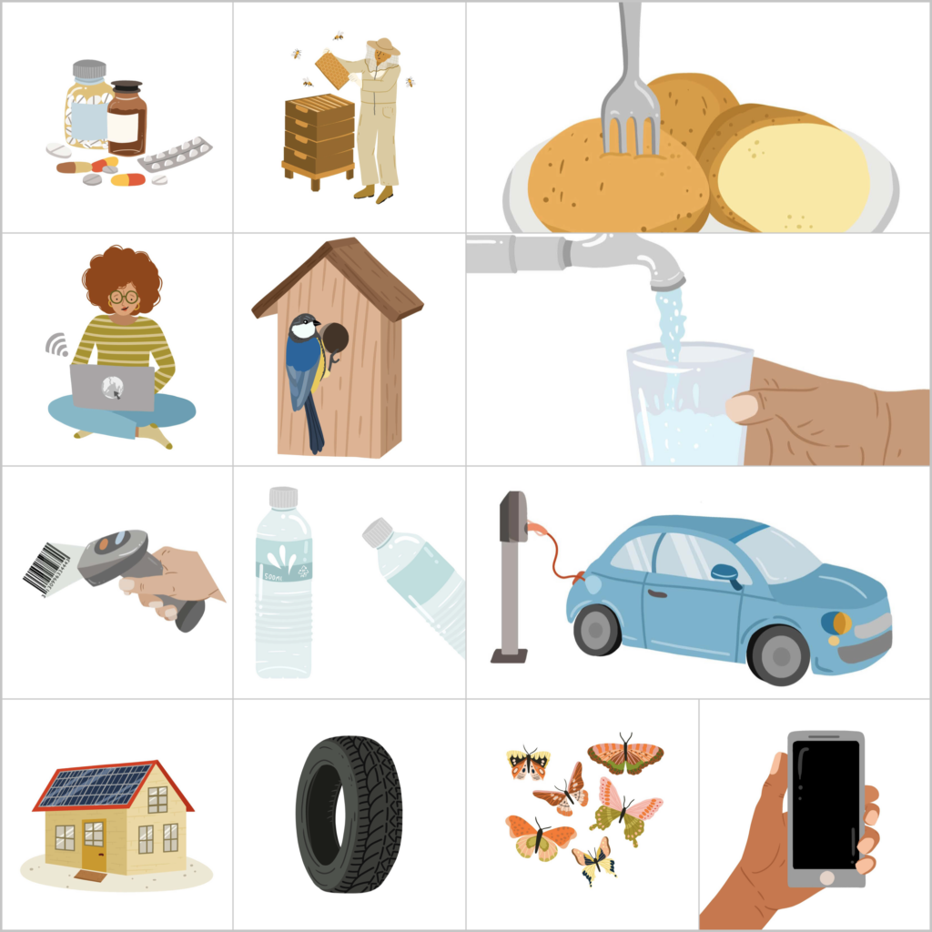 De leerlingen spelen het kaartspel in de klas. Er zijn twee soorten kaarten. Op de blauwe kaarten staan wetenschapsgebieden genoemd, zoals scheikunde, biologie en informatica/ICT. Op de kaart staat uitgelegd waar het wetenschapsgebied over gaat. Daarnaast zijn er kaarten met plaatjes van voorwerpen, bijvoorbeeld een aardappel, een streepjescode en een koolmees.